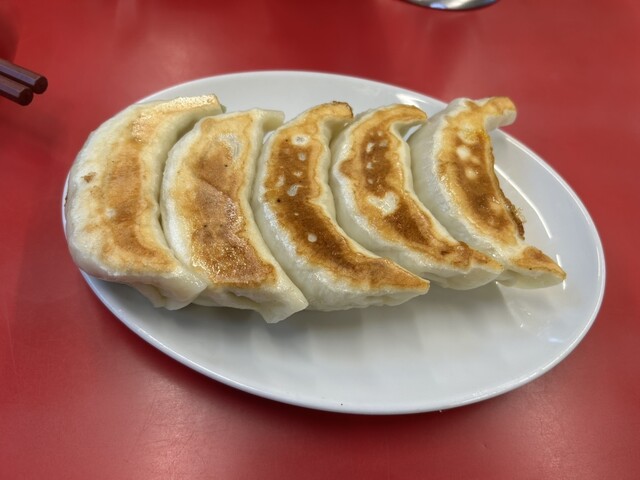 ラーメンと餃子5個を注文、どちらも美味しかったー!少し不揃いの中太麺に肉厚なチャーシュー、歯ごたえのある大きめのメンマとしゃきしゃきのネギ。あまり醤油系は食べないのですが、少しだけ甘みのある優し目の味にしっかりと旨みがあり、どれも美味しかったです!途中味変用に卓上にある胡麻の辣油?を掛けると一気に辛味が強いパンチのあるラーメンに変わります。スプーン大盛り1杯入れるだけで一気に辛くなりますので少しずつ足す方がいいですね!これもまた美味しかったです。