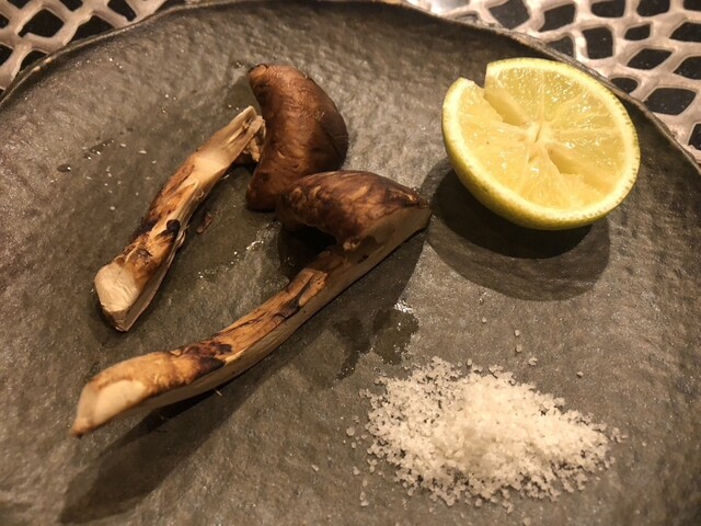 次、松茸の炭火焼き。そして、松茸をホイルで蒸し焼きにして、炭火焼きにしたものです。同じ松茸でも、調理法で風味が変わりますね〜。