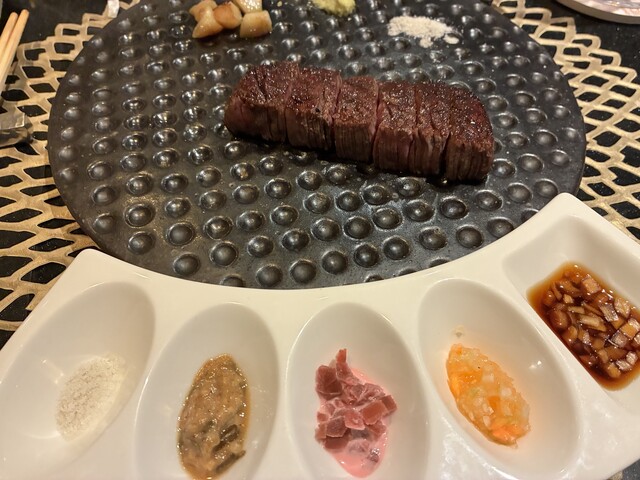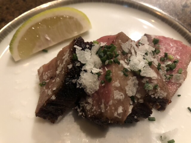 そして、お肉へ。まずは、牛タンを炭火で表面をカリッと焼いたものに岩塩。絶妙な火の入り方で、こんなに美味しいタンは、生まれて初めてかも…^_^ 次にヒィレと思いますが炭火焼きにしてソースと茗荷乗せ。うっま〜い!お肉のFINは定番の鉄板焼、しっかりソテーしたガーリック、生胡椒もお好みで^_^お肉は、グラスの赤ワインにお供していただきました。