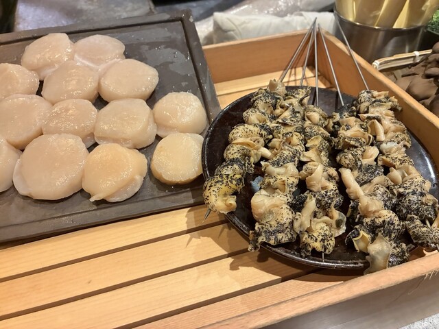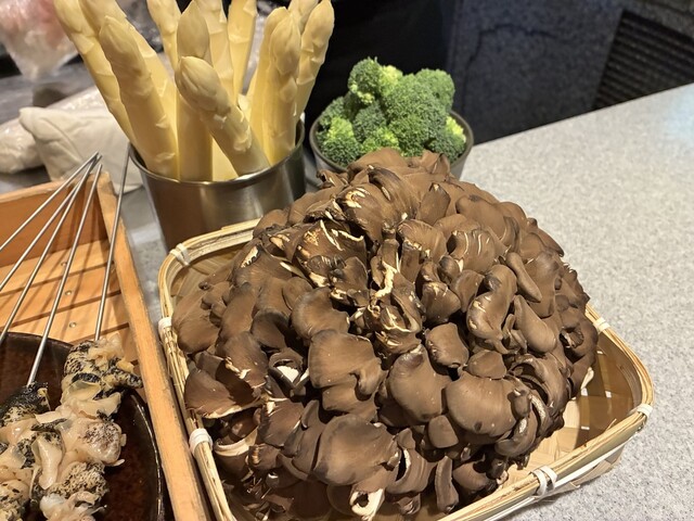 個人的には2回目?くらいの訪問で数年ぶりかな?このお店の特徴は、パイナップルと違い、鉄板に加えて炭火でも調理してもらえます。本日の食材は写真の通り。ヒィレ肉、牛タン、車エビ、松茸、イサキ?昆布締め、毛蟹など…^_^見ているだけで、ワクワクしますねー♪