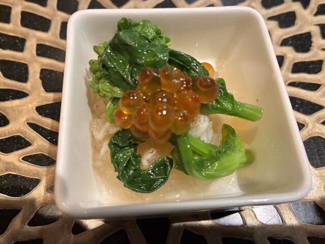次に、カニ身のカニミソ和え、紫蘇の花の香りも楽しみつつ。絶品です。紫蘇の花も木箱に入っていて、選りすぐりなのでしょうね。