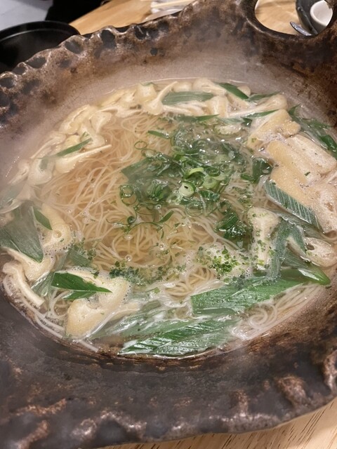 来店し、大将が我々の様子を見つつ、お勧めしてもらって前回も食べたハマグリと豆腐の鍋を頂きました。残った出汁で今回は煮麺(前回は雑炊)!