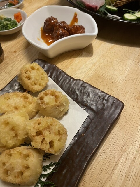 メニューから蓮根天ぷらなど和の食材と店主おすすめの日本酒を楽しみましたが、今回も箸休めにタコさんウインナーとミートボールを注文!