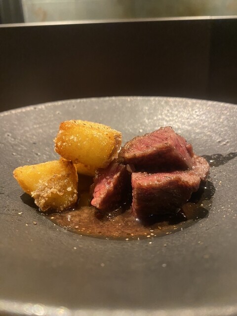 黒毛和牛イチボのステーキと北海道雪室熟成メークイン素揚げの組み合わせが最高。柔らかくて旨みたっぷりで美味しい。じゃがいもの表面の焼き加減も良く、ワインソースとの調和も良かった。