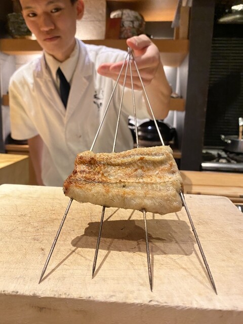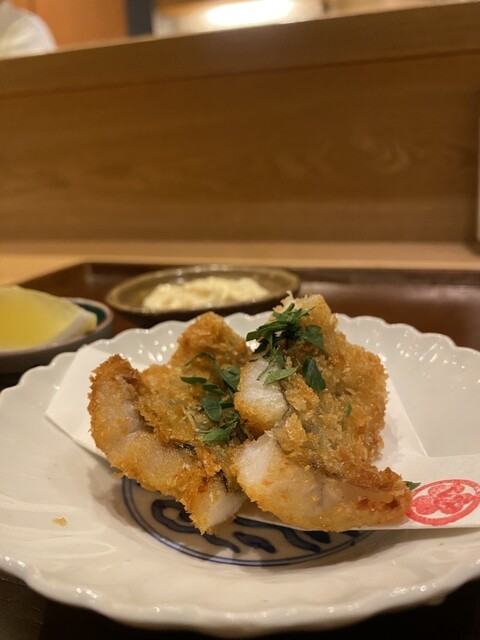 →先ほどいただいた茶碗蒸しの鱧で、舞阪港での漁は終わってしまったので食べ納めできて最高。腕ぐらいの太さの鱧で普段あまり食べれない珍しい鱧を使っている。衣がサクッと身がふっくらで、実山椒タルタルの痺れのアクセントも堪らない。
