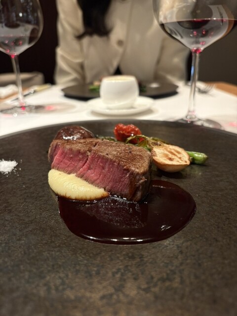 絶妙な火入れで仕上げた東京ビーフのフィレ肉は、柔らかく断面が美しいピンク色。トリュフを贅沢にあしらったペリグーソースが香り高く、深みを添える。付け合わせのトレビスのほどよい苦味が心地よい口直しとなり、全体を引き締める。