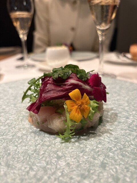 瞬間燻製の演出とともに、立ち上る香りが印象的な一皿。寒ブリと菜の花をタルタル仕立てにし、こちらもお花を添えた美しい盛り付け。下にはレフォールソースを忍ばせ、まろやかさの中に程よい辛味をプラス。上にはエンダイブやルッコラなど、苦味のあるサラダを重ね、燻香・脂・苦味のバランスが最高。