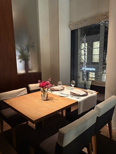 東京駅からもすぐの立地。全面ガラス張りの窓から緑が望める素敵な空間は、季節ごとに表情を変える景色も楽しめます。店内にはフレッシュフラワーが華やかさを添え、より特別なひとときを演出してくれます。