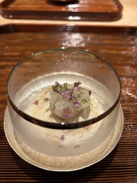 鱧はふわっと軽やかな食感、湯葉はとろけるようななめらかさ。下には長芋が敷かれ、食感のコントラストが楽しい。