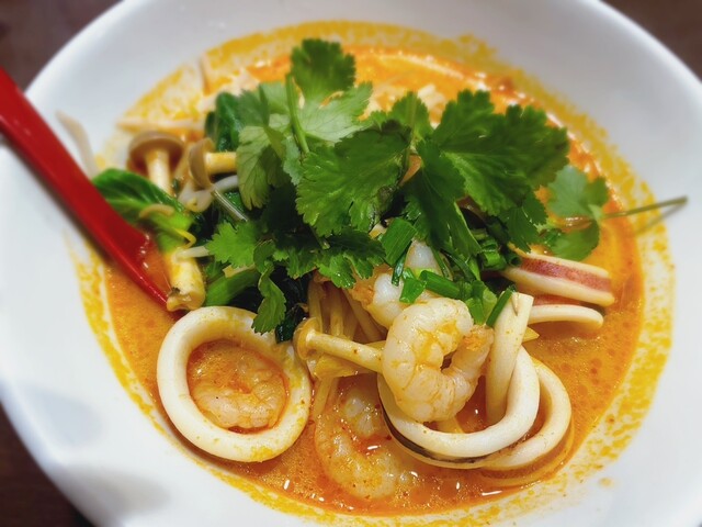 東南アジアと中華料理の飲食店が多い大塚北口のタイレストランです。トムヤムラーメンのスープは甘辛で酸っぱく、シーフード。具材はエビとイカでした。スープは美味でした。
