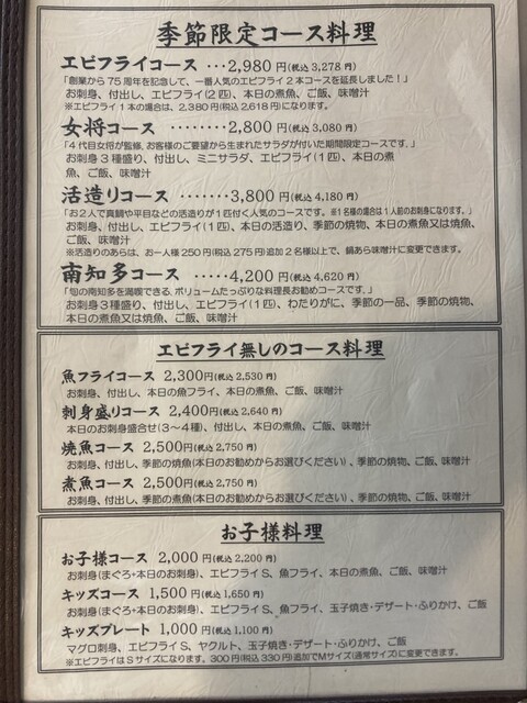 付き出し(もずく酢)、お刺身、エビフライ、焼き魚(鯛)、ワタリガニ、お味噌汁、ごはん。
