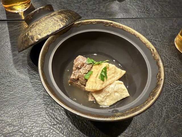 やわらかく仕上げた和牛・厚揚げ・湯葉で巻いた海老しんじょうのお椀はおでん仕立て。