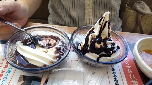 ソフトクリームもありトッピングのフルーツ みつ豆 団子などがあり。個人的にはラズベリーとイチゴが好きです。