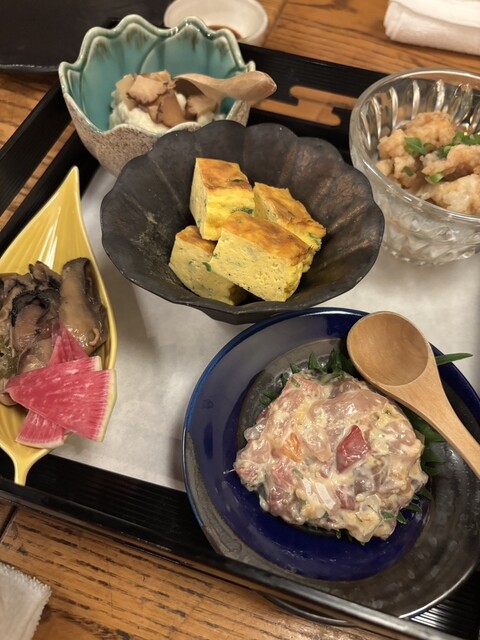前菜盛り合わせ、お刺身、焼き魚、天ぷら、炭火焼き、お食事