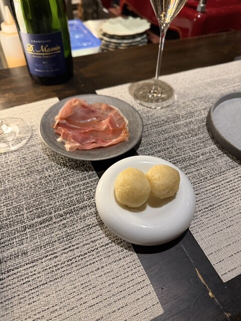 宴の幕開けは、シャンパーニュ「ドミニク・マサン」と共に。合わせたのは、揚げたてのニョッコフリットと極薄の生ハムです。揚げたての温かい生地の香ばしさとハムの塩気を、きめ細やかな泡が包み込む。この一皿目で「あ、ここは普通じゃない」と確信しました。