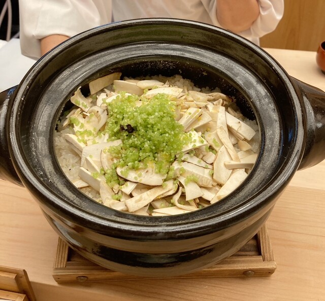 土鍋松茸ご飯 大量の松茸。香りがものすごい。ずっと残ってた。やっぱこれくらい厚めスライスの方がいいんだな。歯応えも香り成分もしっかりしてる。周りが少食で余ってたからバクバク食べてお土産にもしてくれた。腹パンすぎ。