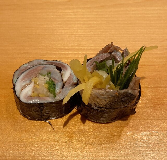 いわしの海苔巻き イワシはしっかり赤酢でしめている。ふだん脂しっかりめの鰯海苔巻きしか食べたことなかったから、こーいうのもあるのねといい体験。いろいろ薬味入ってて好き。