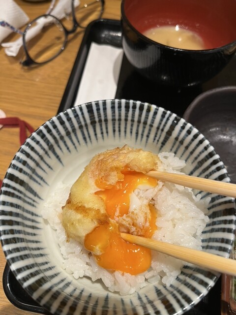 玉子天ぷらを、ご飯の上で、