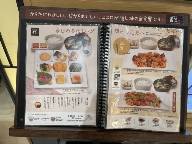 百菜ランチは仕切りのあるプレートに、焼き魚や卵焼き、野菜の煮物や豆料理など、少しずつ色々なおかずが並んでいて、見た目にも華やか。ごはんは白米と雑穀米が選べ、味噌汁と小鉢も付いて、ボリュームも満足感も十分でした。