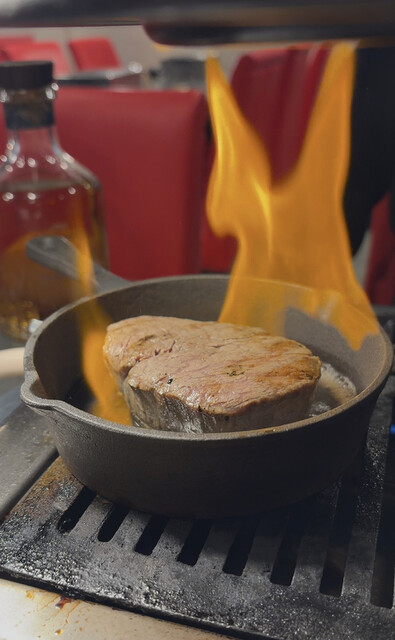 サシの状態を評価した時の最高位である12点から由来した店名で、エスカレーターを上がって左手進むとずらりと鮮やかな赤色をしたお肉たちがお出迎え。