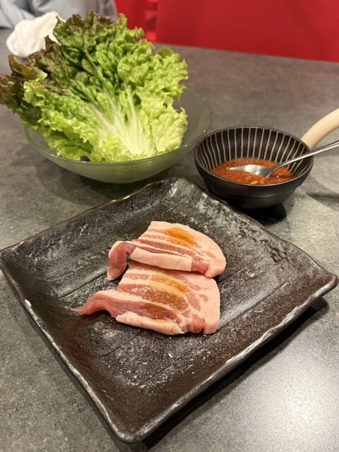 肝心のお肉は、焼き目がつくくらいしっかりと焼くことで、脂がいい感じにカリッとした食感に!アツアツ、より香ばしい状態でみずみずしいレタスに包んでタレをかけるとお肉の香ばしさはそのままですが、余計な脂を吸収してくれるので意外にあっさりと。そしてタレがいい感じにアクセントになってもはや1枚では足りません笑