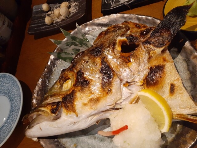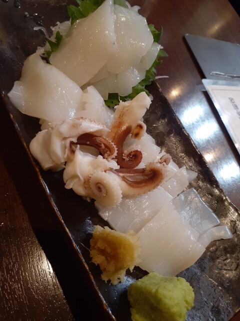お寿司屋さんを眺めすぎていて魚介の我慢ができずに身近なこちらへ。まずは、ビールに枝豆。そこから特旬三点盛り、鯛かぶと焼きを。相変わらずの七点盛り。(人数見て三切れになってるし!) どれも美味しいのだけどコウイカが抜群。