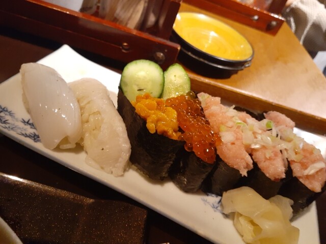 貝味噌、マグロール、涙巻き、追加三点盛りで〆。