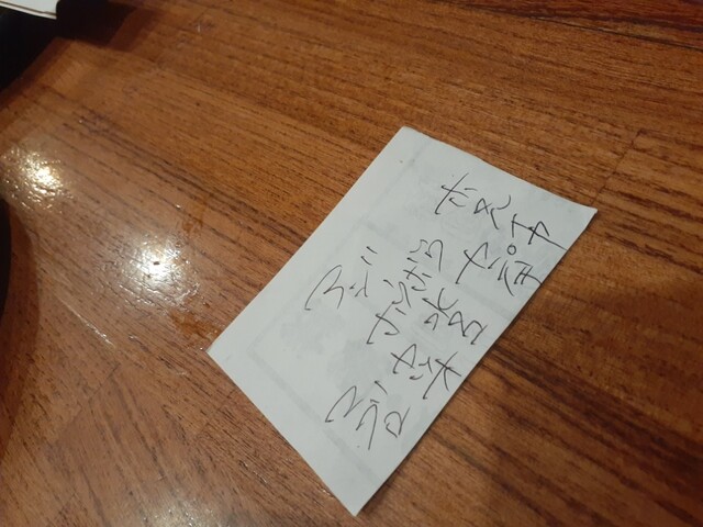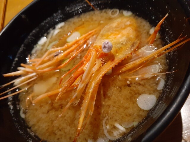ようやく落ち着いてさっきの海老頭のサービス揚げ(マジ旨い)、肴のクリームチーズの味噌漬け、アジフライ新玉ねぎフライ、単品穴子一本握りときて、〆の生海苔味噌汁。