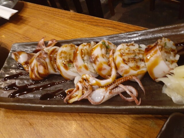 〆は同じく初見のヤリイカ丸ごと寿司。軽く茹でられた身の中にすし飯が詰められており、ツメが合います。