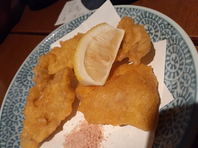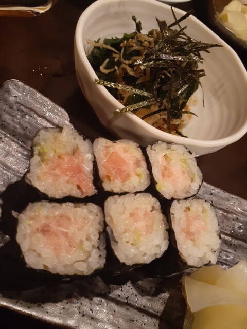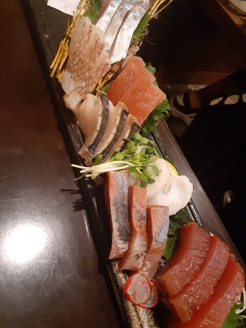 未成年には早めに食べさせるべくマグロール、さつまいも天を注文。さらに本日のオススメから白子ポン酢、白子の昆布焼き、刺身の三種盛り(ウスバハギ、キンメ、カツオ、生本マグロ、〆サバ、サワラ、ブリ、サンマ、フエフキダイ)で刺身も食べさせて一安心。