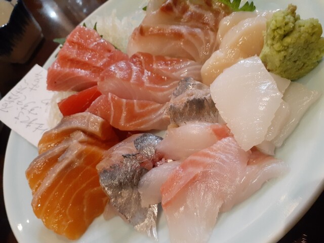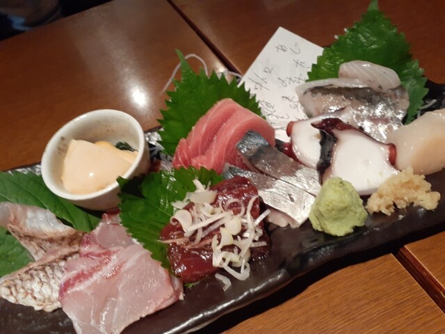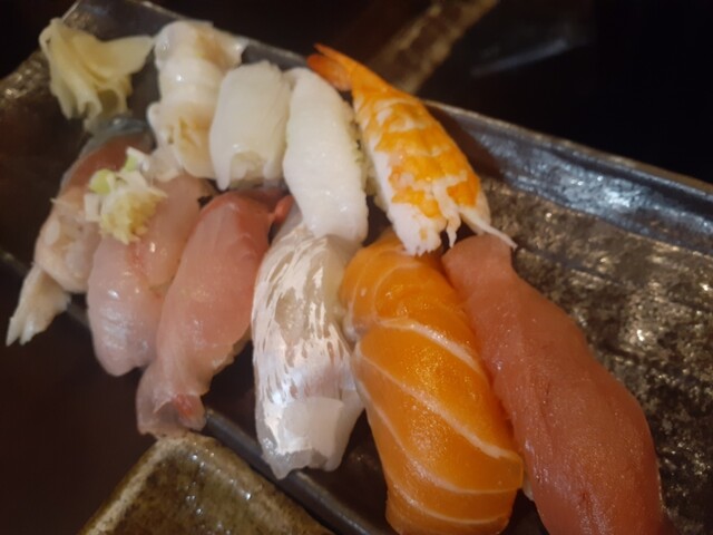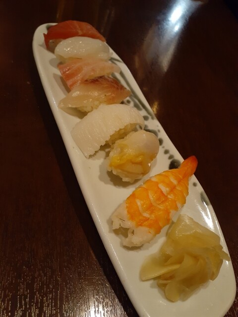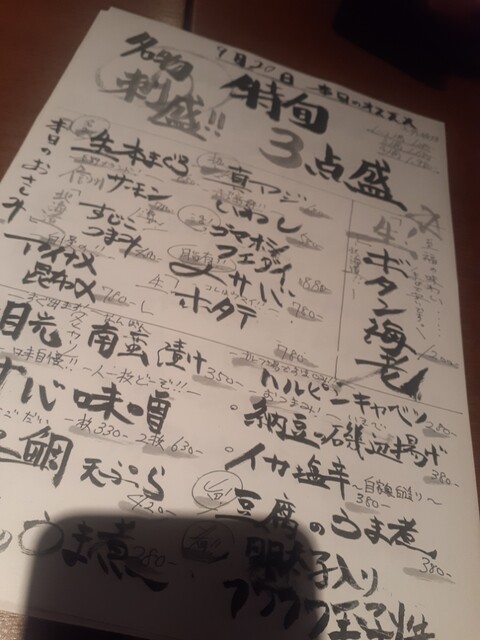 特旬三点盛りは富士サーモン、生本マグロ、ほたて、ソデイカ、虎ふぐ、タコ、つぶ貝、ブリ、アジ。個人的にはソデイカの炙り薄造りが丁寧かつ美味しかった。(全部うまいんだが)