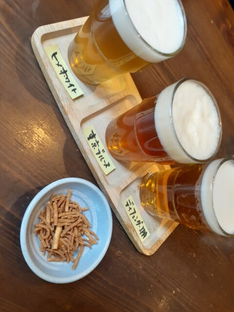 まずはビールと思いきや黒板にクラフトビール3種で1,200円があったので、どうせ生二つするならと奥さんとシェアしました。どれも個性的でまさに飲み比べ。