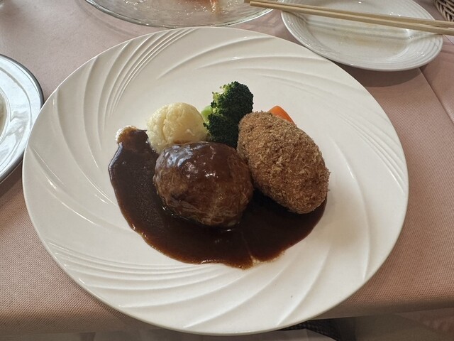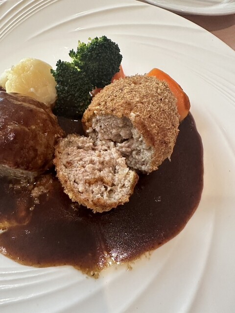 ハンバーグは、少し硬めで肉肉しい、ソースと相性抜群。