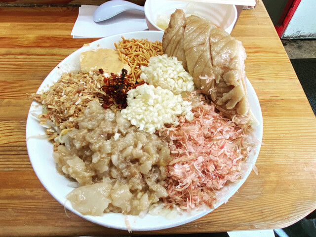 「まぜそば」並 / 小豚1枚追加/ 無料トピ全マシ(にんにくマシマシ) 並でこの破壊力♪♪♪