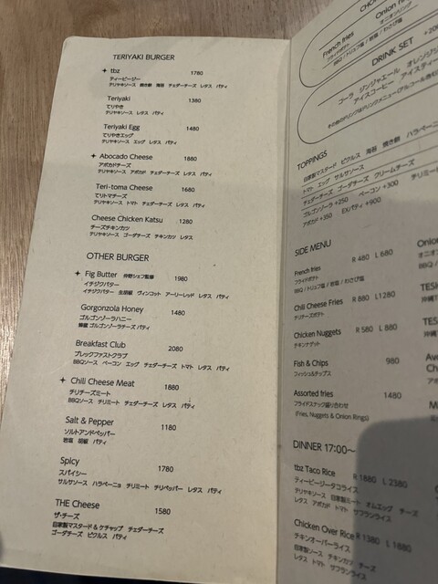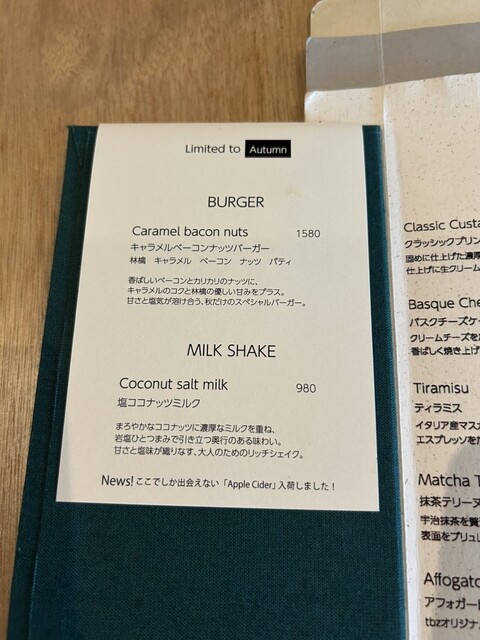 イチジクバターのバーガー、tbzバーガー、オリオンビール×2、季節限定の塩ココナッツミルクシェイクを注文。