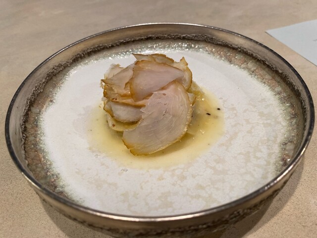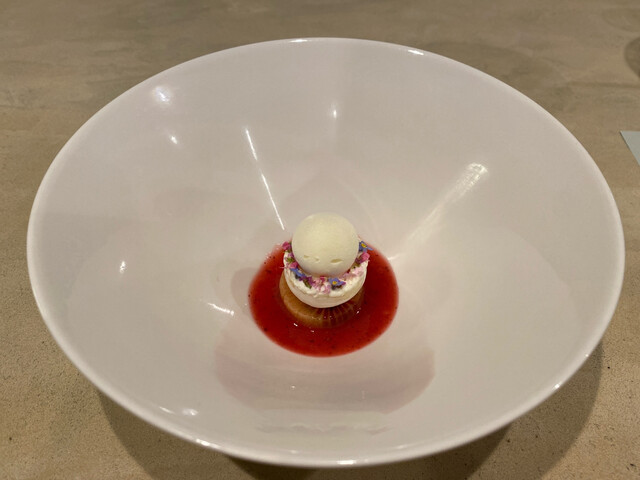 春菊のセミフレッド、パイナップルのペクチン。春菊がデザートとは思いませんでした。春菊の苦さはほとんど感じず、セミフレッドなのでザクっとしています。パイナップルのソースは皮と芯からペクチンだけ抽出したとのことでパイナップルの甘さが春菊に合います。