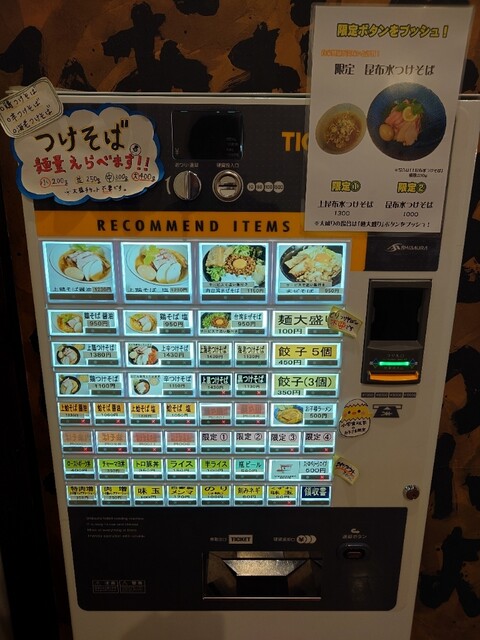 今回は昆布水つけそばと麺大盛りの食券を購入しました。