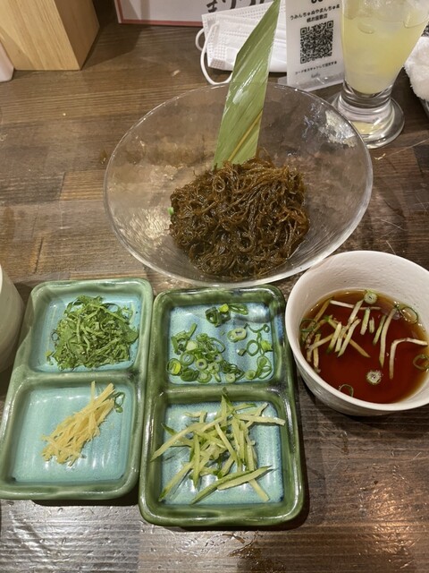 ・もずくのそうめん→薬味が4種類あり、生姜の千切り、きゅうり、小口ネギ、しそを鰹出汁でいただきます。これがさっぱりしていて美味しい!これも大満足!