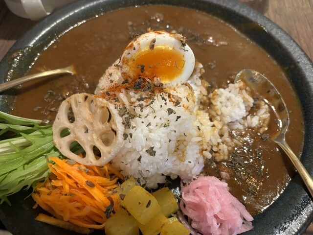 ルーと付け合わせの野菜だけでも、充分でしたー♪辛さはそんなに辛く無く、足りない方にはスパイスがテーブルに有ります。