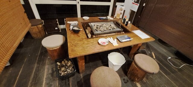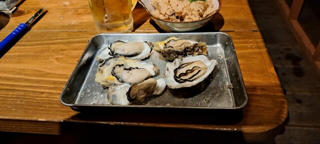 店内は結構広く、流れてくる音楽も今風や昔の洋楽が流れてます。今まで行った牡蠣焼きのお店はイイ意味で如何にも「牡蠣焼き小屋」の感じが出てましたが、ここは人数に合わせた個室もあり、居酒屋風の感じがします。それもそのはずで、コロナ禍になる前までは牡蠣のシーズン以外は居酒屋として営業してたみたいです。店員さんの接客も大きな声が出ていて、明るく感じがイイです。