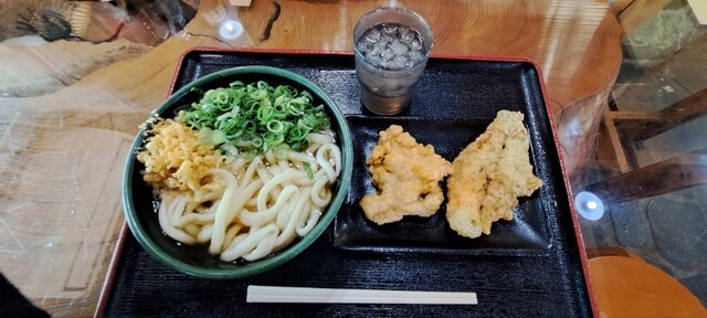 かけうどん(熱 中2玉)、とり天、カレイの天ぷら