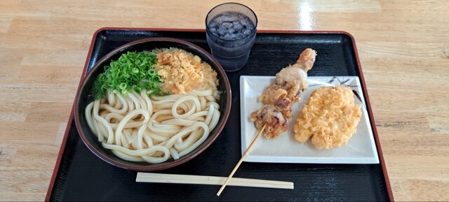 かけうどん(2玉)、イイダコの天ぷら、鶏天