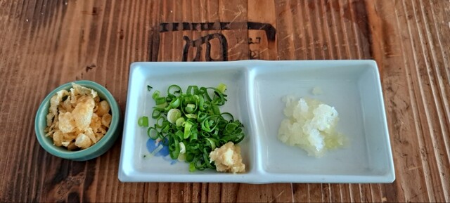 他にも薬味のネギ、生姜、大根おろし、天かす等は別の小皿に入ってます。また、オリジナルの醤油のミニボトルと、一味も一緒に付いてきます。