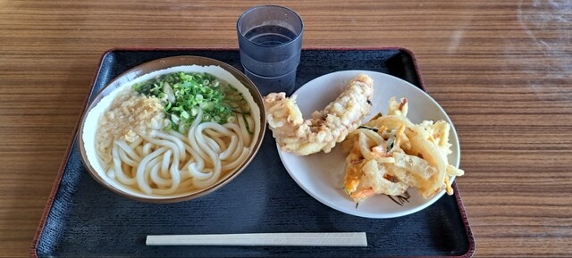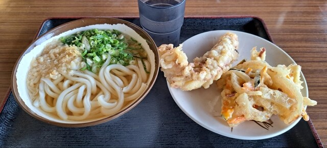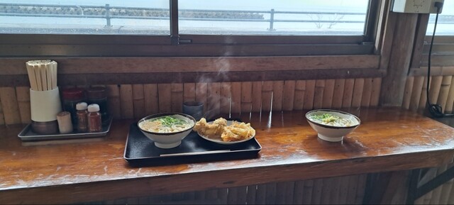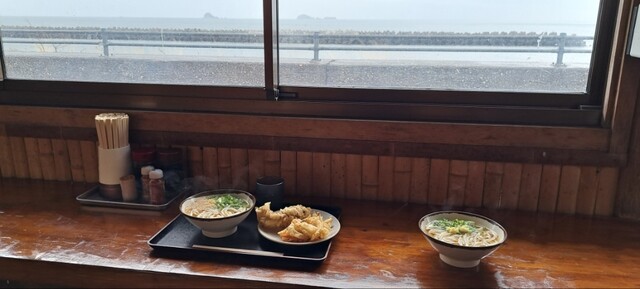 かけうどん(小)、ゲソ天、かき揚げと海の景色
