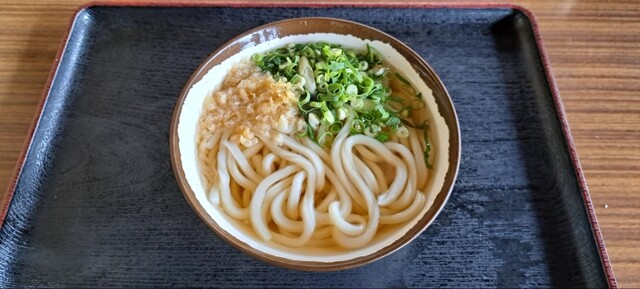 早速天ぷらを取って「かけうどん(小)」を受け取り、セルフのネギ、天かす、生姜を入れます。