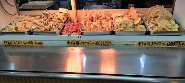 開店直後だったので天ぷら、おにぎりが豊富にあり、特に目を引いたのが一番下段にある小さめの天ぷらが「よりどり3ケで100円」、「1ケ40円」という破格的な安さです!!
