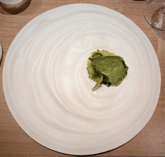 バターミルクを液体窒素でパウダー状にしたものをかけて頂き、生秋鯖の新鮮さに舌鼓を打ちます。
