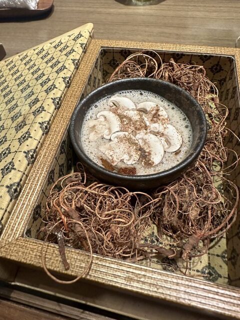 次は、キノコの描かれたアンティーク調の本がサーブされます。本の表紙を開く時のドキドキ感も楽しい。本の中には綺麗な茸が✨