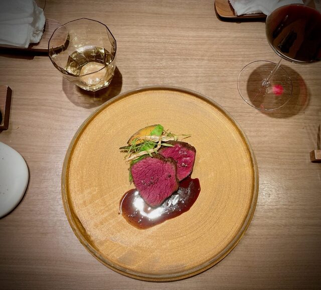 ■メイン 蝦夷鹿ロースト。とてもきれいな色の赤身は柔らかくもしっかりした歯ごたえで、赤ワインとフォワグラと黒胡椒のソースを絡めて旨味を存分に味わいます。付け合せの野菜の食感や旬の甘みもとても贅沢。