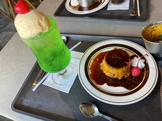 プリンは甘さ控えめでほろ苦いカラメルソースとの相性抜群です。クリームソーダはアイスがデカくて(ありがとうございます)、油断するとこぼれますのでご注意ください。